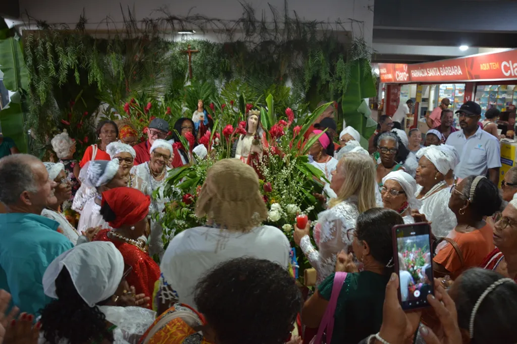 As comemorações, que representam o sincretismo em sua mais perfeita definição, serão iniciadas cedo. Uma missa em ação de graças será celebrada às 7h, no Santuário Senhor dos Passos. Depois, grupos de fiéis, acompanhados de baianas, sairão em procissão pela rua Olímpio Vital, sentido ao entreposto. Lá circularão pelas dependências com as imagens da santa.