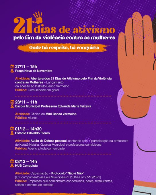 A abertura oficial da campanha “21 Dias de Ativismo pelo Fim da Violência contra as Mulheres”, uma iniciativa internacional que busca promover o respeito, a igualdade e o enfrentamento de todas as formas de violência de gênero, tem início nesta quinta-feira (27). A Prefeitura Municipal, por meio da Secretaria Municipal de Políticas para Mulheres (SMPM), participa da iniciativa com o lema “Onde há respeito, há Conquista”.