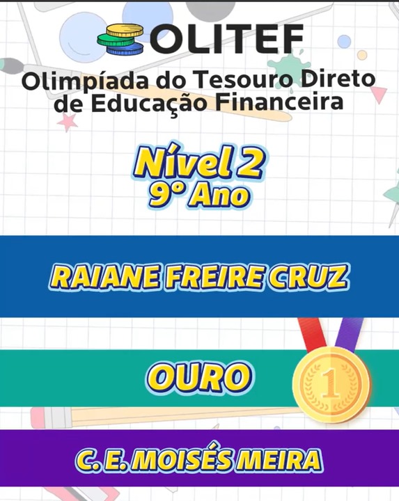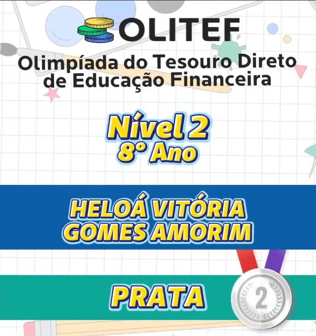 Olitef – uma iniciativa nacional gratuita que busca promover o conhecimento financeiro entre alunos do 6º ano do Ensino Fundamental até o 3º ano do Ensino Médio. Realizada em parceria entre o Tesouro Nacional e a B3, com apoio do MEC, a olimpíada incentiva a educação financeira desde cedo, preparando os estudantes para o futuro.