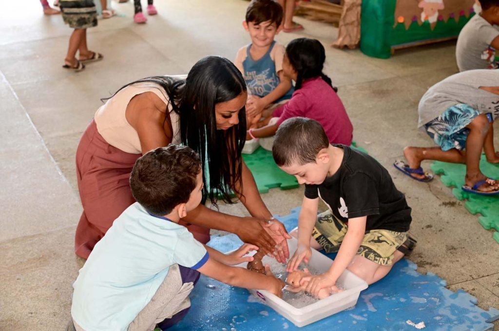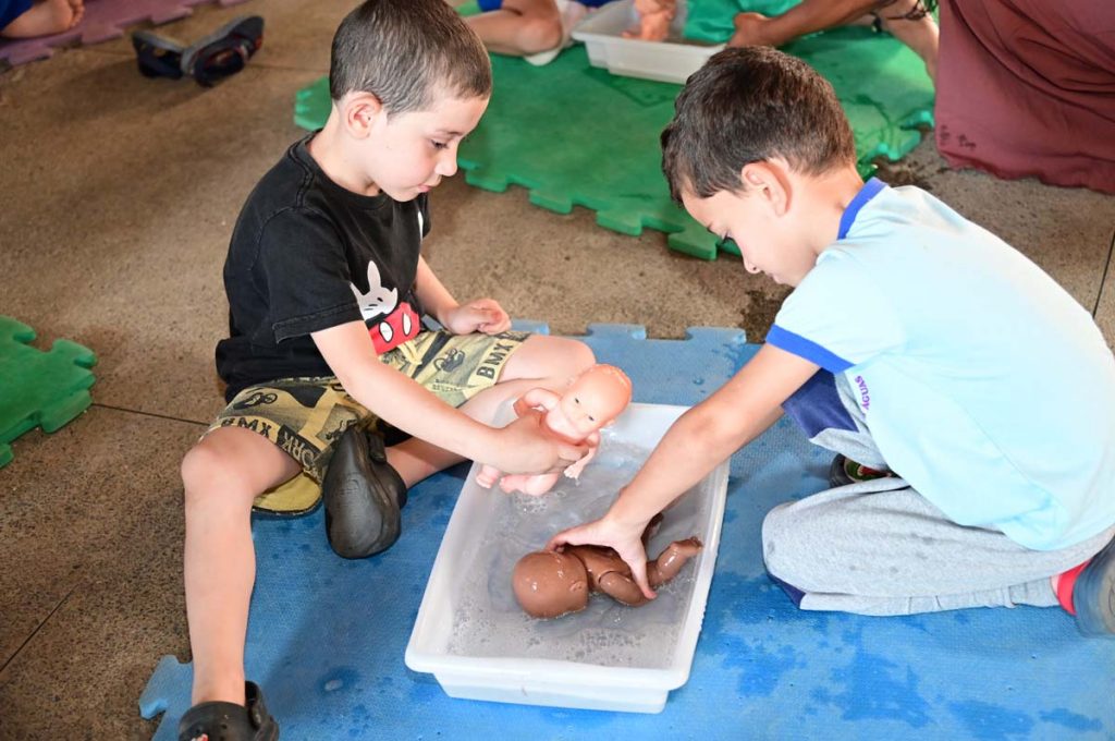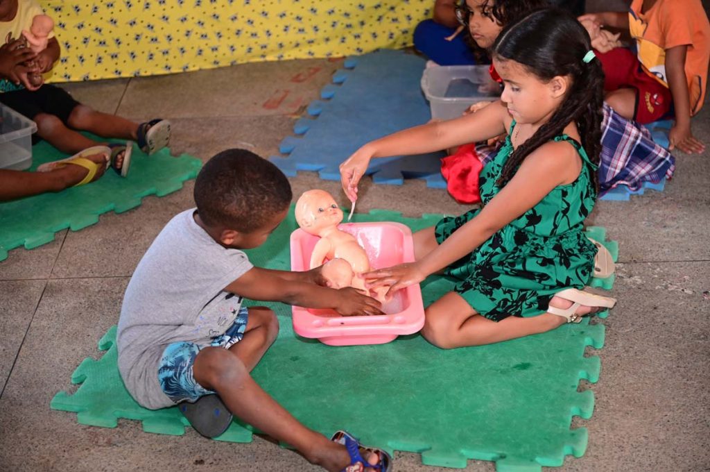 Os estudantes também tiveram um momento para dar banho nas bonecas. “Com essa atividade trabalhamos questões relacionadas ao cuidado e ao corpo da criança, afinal elas aprendem brincando”, ressaltou a diretora.