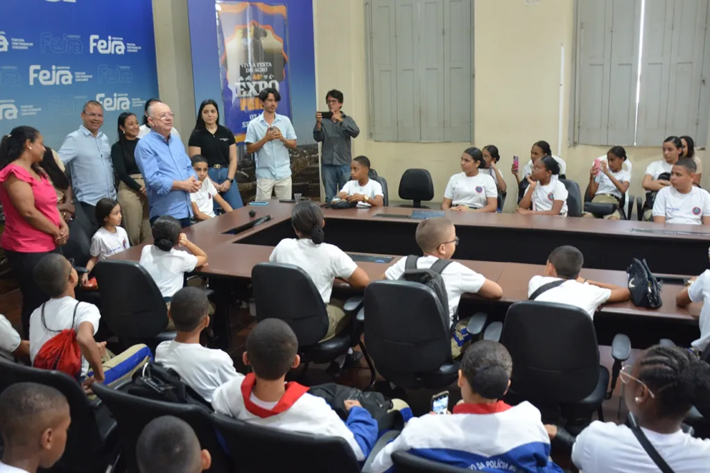 Alunos do Colégio da Polícia Militar Diva Portela, do bairro Campo Limpo, conheceram o Paço Municipal Maria Quitéria, onde está instalada a Prefeitura de Feira de Santana, nesta terça-feira (26). A programação, como parte das atividades de projeto educacional, foi realizada durante todo o dia, sendo que, pela manhã, os alunos foram recebidos pelo prefeito José Ronaldo de Carvalho, um entusiasta da educação como ferramenta transformadora de desenvolvimento da sociedade.
