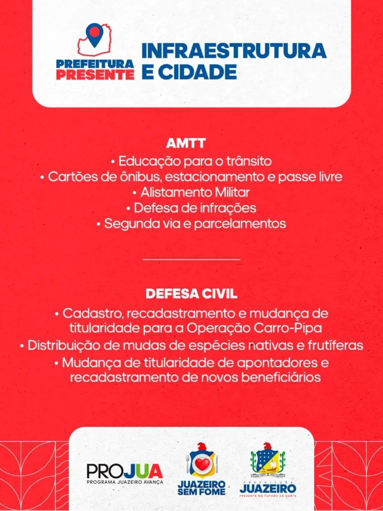 A segunda edição do programa acontece neste sábado (28), das 8h às 13h, no distrito de Pinhões. A iniciativa da Prefeitura de Juazeiro reúne todas as secretarias e órgãos municipais em um grande mutirão de atendimento, oferecendo uma ampla gama de serviços públicos à população da sede e do interior do município.