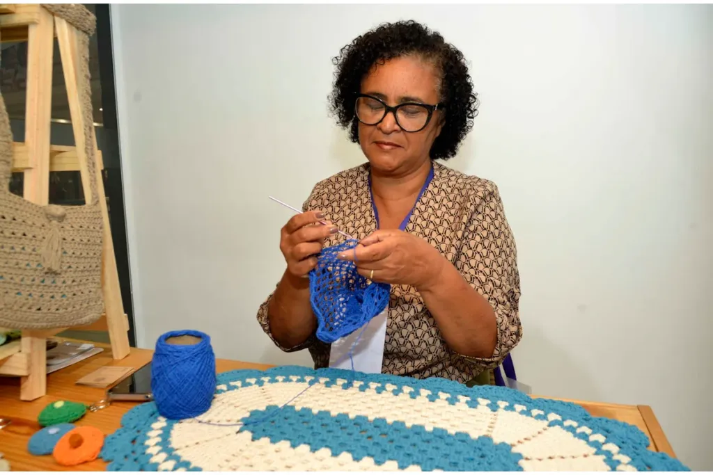 Edinalva Santiago tem 73 anos, é crocheteira há pouco mais de duas décadas, e hoje tem a prática como aliada do bolso mas, principalmente, da saúde emocional. “Iniciei nessa arte após passar por um período de profunda depressão. Foi uma necessidade na época e o crochê me tirou dessa situação. Com o tempo fui encorajada a participar de feiras, até que conheci a Expo Mulher, que me acolheu, e hoje participo de diversos eventos desse tipo, tendo o crochê como parte muito importante da minha vida. É um negócio, mas é muito mais uma forma de viver e ser feliz”, diz.