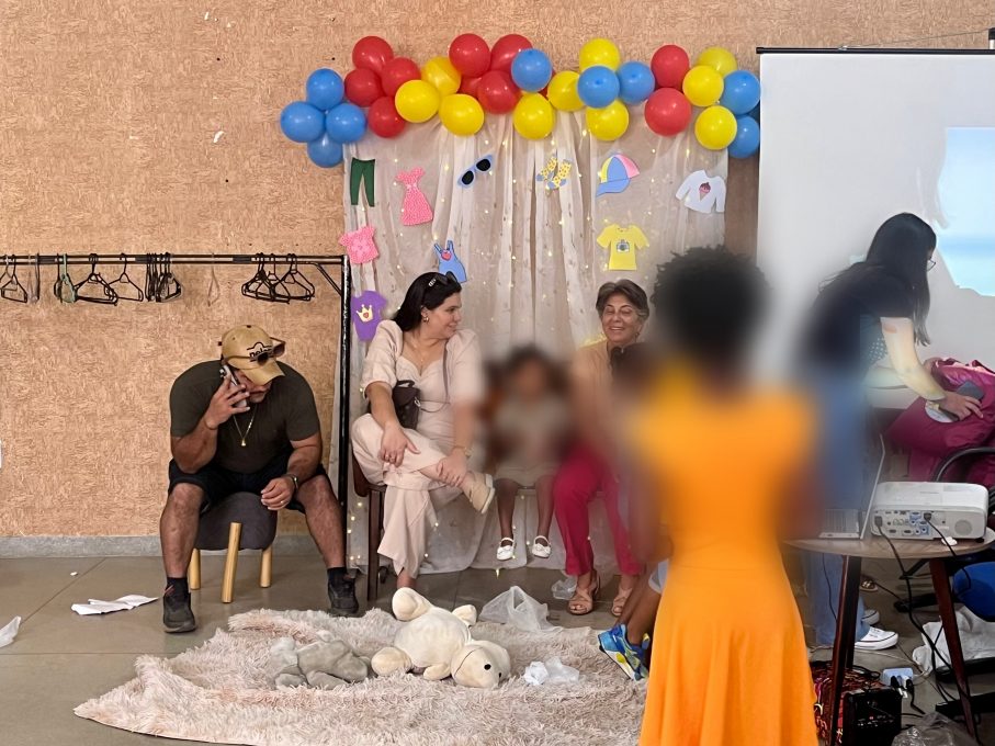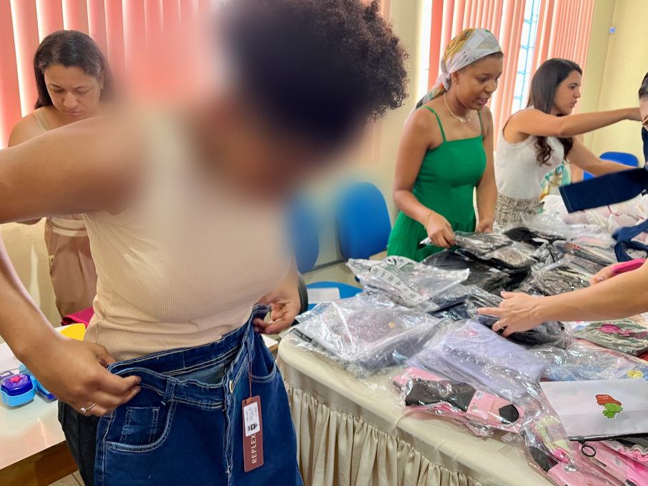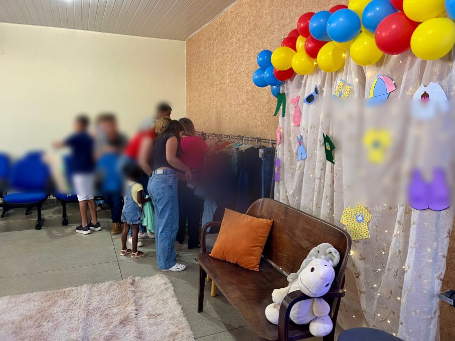 O espaço foi organizado como uma loja, com peças de vestuário dispostas para escolha, balcão de vendas e caixa registradora, com condução dos trabalhadores da Proteção Social Especial (PSE), que atuaram como atendentes, auxiliando nas decisões e no uso do recurso disponível. Cada participante recebeu um valor simbólico para realizar suas compras, sendo orientado a observar critérios como numeração, preferências pessoais e quantidade de itens.