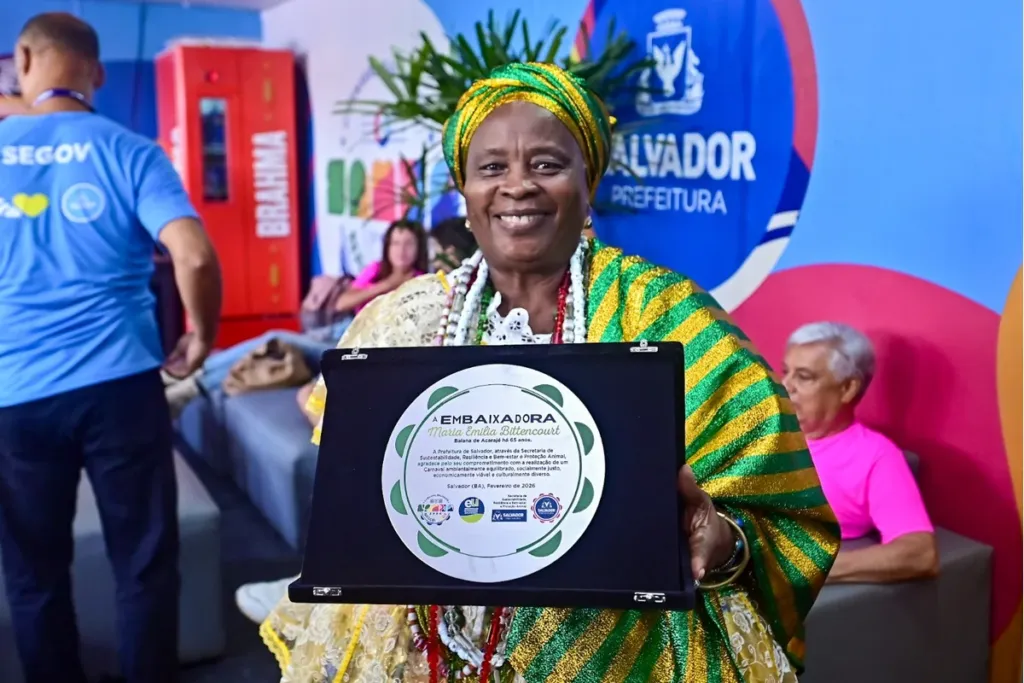 A Prefeitura de Salvador, por meio da Secretaria de Sustentabilidade, Resiliência, Bem-estar e Proteção Animal (Secis), entregou à baiana de acarajé Maria Emília Bittencourt, neste domingo (15), a placa de Embaixadora do Carnaval Sustentável 2026.