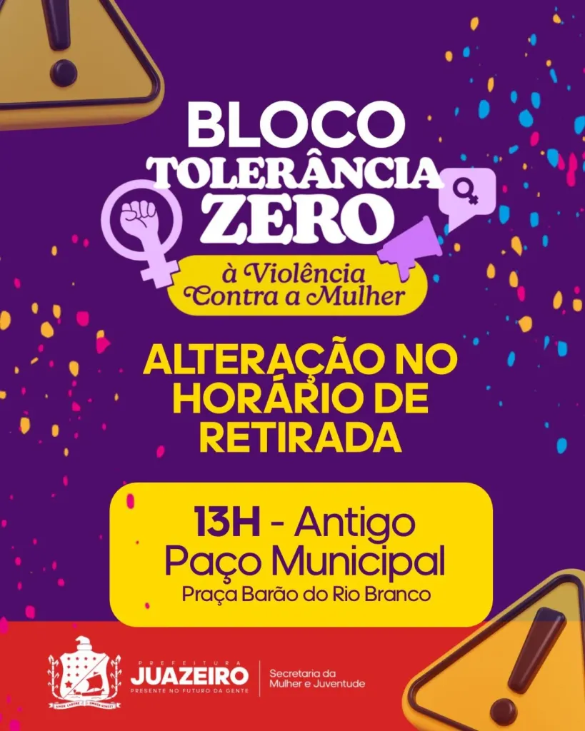 A Prefeitura de Juazeiro, por meio da Secretaria da Mulher e Juventude (SMJ), informa que houve alteração no horário de retirada das camisas do Bloco Tolerância Zero à Violência contra a Mulher.