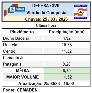Na tarde desta quarta-feira (25), foi registrada uma média de 6,75 mm de precipitação de chuva em Vitória da Conquista, chegando a 11,32 mm no Centro da cidade, de acordo com o Boletim da Coordenação de Proteção e Defesa Civil (Compdec), com base nos dados do Centro Nacional de Monitoramento e Alertas de Desastres Naturais (Cemaden). A previsão apontava para até 5mm.