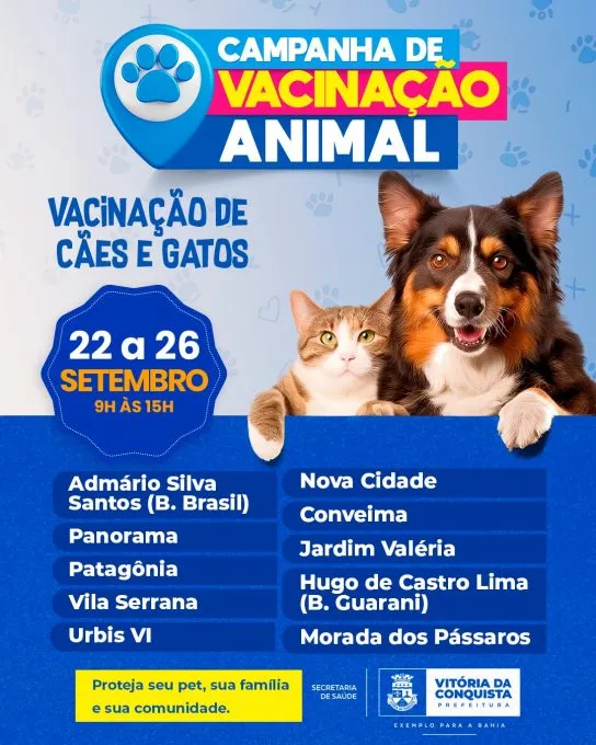 A Prefeitura Municipal de Vitória da Conquista está na fase de repescagem da campanha de vacinação contra a raiva (antirrábica), com o objetivo de alcançar a meta vacinal do município e assim proteger o maior número de animais. A raiva é uma zoonose, ou seja, uma doença infecciosa causada por um vírus, naturalmente transmissível de animais para humanos e a vacina é a principal forma de prevenção.