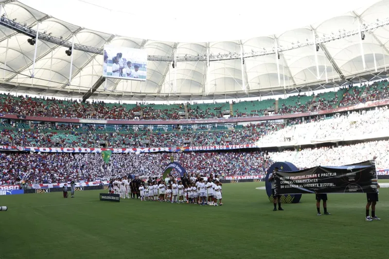 Antes do início da partida entre Bahia e Bragantino, iniciada às 16h deste domingo, 2, na Arena Fonte Nova, o Ministério Público do Estado da Bahia (MPBA) promoveu a campanha “O cuidado não pode ficar só no off”, com o objetivo de conscientizar sobre a proteção de crianças e adolescentes no ambiente digital. A ação incluiu a divulgação da plataforma “Fala, Filho”, que orienta pais, responsáveis e cuidadores sobre como abordar o tema. Vídeos e faixas da campanha foram exibidos na abertura do jogo, nos telões e no gramado.