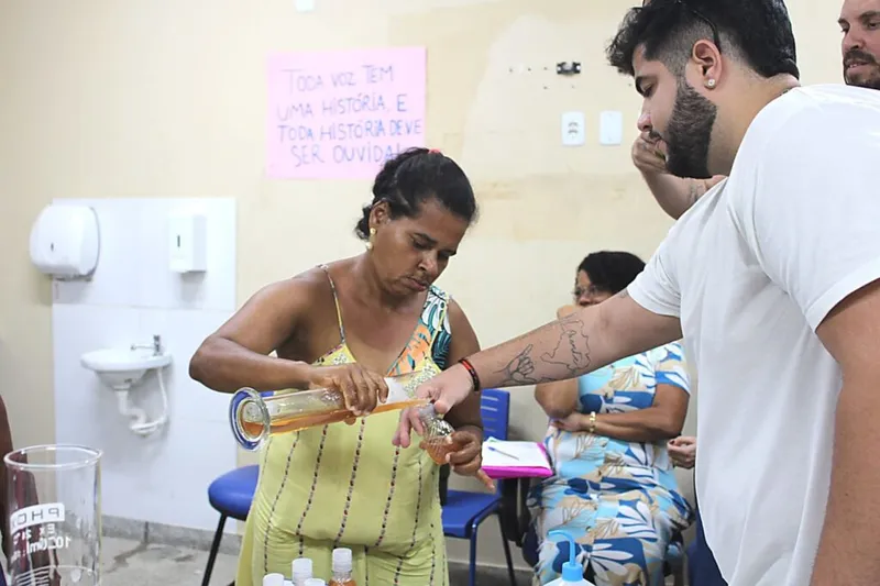 Durante a atividade, o professor da Faculdade de Farmácia da Universidade Federal da Bahia (UFBA) Douglas Rambo conduziu uma oficina prática com os usuários da unidade, ensinando a produção de sabonete líquido artesanal e utilizando plantas medicinais. Ele orientou sobre todo o processo, desde a higienização do ambiente e preparo dos ingredientes até o armazenamento correto e a validade do produto.