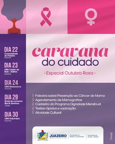 Em alusão ao Outubro Rosa, a Prefeitura de Juazeiro, por meio da Secretaria da Mulher e Juventude (SMJ) e Secretaria de Saúde, lança a 1ª edição da Caravana do Cuidado, uma ação itinerante que percorrerá os bairros e comunidades do interior, levando serviços gratuitos de saúde, bem-estar, prevenção e cidadania para mulheres de todas as idades. A proposta é descentralizar o atendimento e garantir que mais mulheres tenham acesso a direitos essenciais.