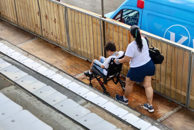Pela primeira vez na arquibancada social, montada pela Prefeitura de Salvador no Campo Grande, o casal Damares Martins e Virgínia Alves levou na manhã deste sábado, dia 14, os filhos, entre eles um cadeirante, para curtir as atrações artísticas voltadas ao público infantil no Circuito Osmar. “Até agora, nos pareceu tudo muito bom. Se gostarmos, voltaremos amanhã”, afirmou Damares. Para garantir que o serviço seja prestado da melhor forma possível a 1,8 mil foliões que, como o casal, inscreveram-se para acessar a arquibancada, o Ministério Público da Bahia vistoriou hoje as estruturas do equipamento e dos mirantes acessíveis para pessoas idosas, localizada também na Praça Dois de Julho, e para pessoas com deficiências (PCD), na Piedade.