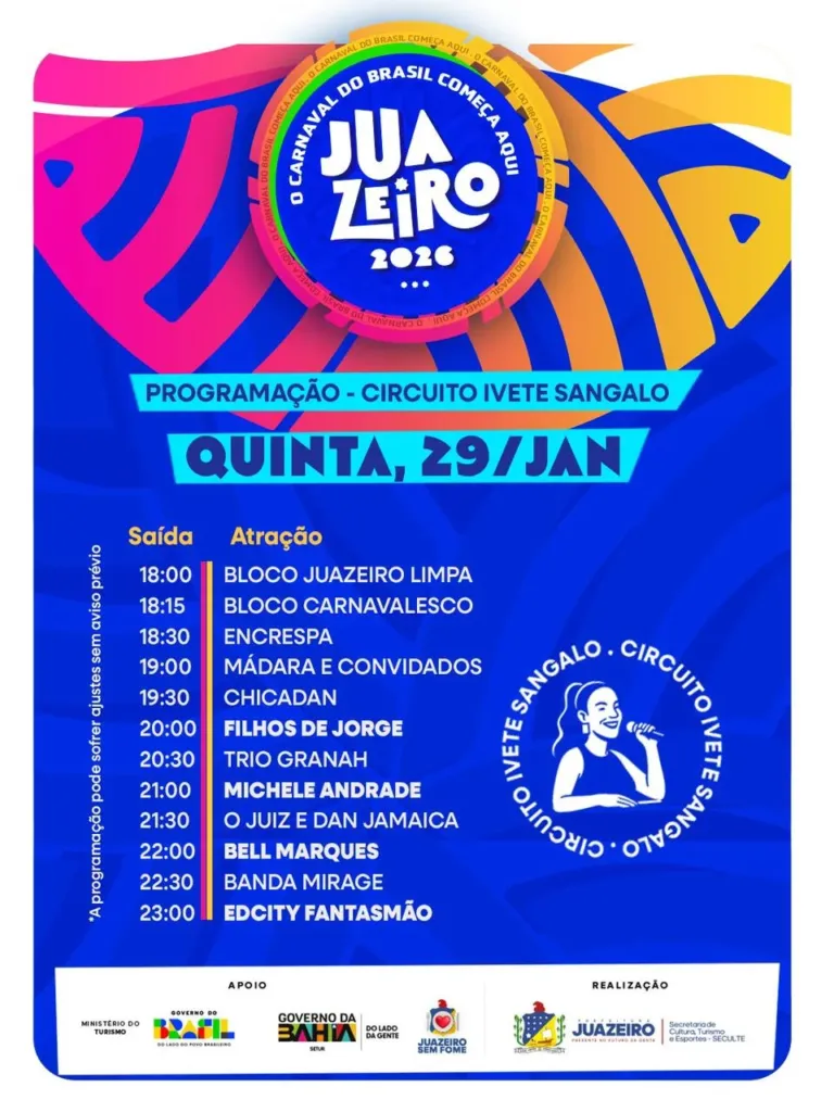 Começa nesta quinta-feira (29) a festa mais aguardada pelos foliões juazeirenses. O Carnaval de Juazeiro 2026 – “O Carnaval do Brasil começa aqui” abre oficialmente sua programação após grande expectativa, levando música, cultura e alegria para os circuitos Ivete Sangalo (Av. Adolfo Viana/Orla I) e Luiz Galvão (Orla II). Logo no primeiro dia, blocos tradicionais e grandes atrações prometem transformar a cidade em um grande palco de celebração popular.