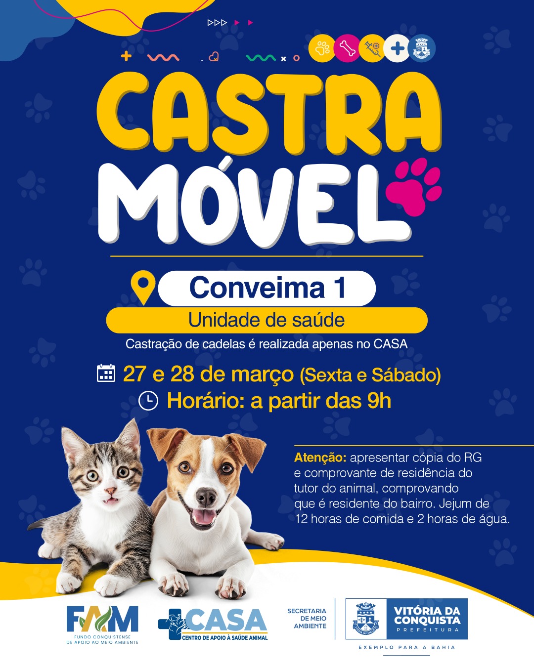 Nesta sexta-feira (27) e sábado (28), o Castramóvel, unidade itinerante do Centro de Apoio à Saúde Animal (Casa), estará no bairro Conveima, para prestar atendimento de castração e microchipagem de cães e gatos. O serviço gratuito é ofertado pela Prefeitura de Vitória da Conquista, por meio da Secretaria Municipal do Meio Ambiente.