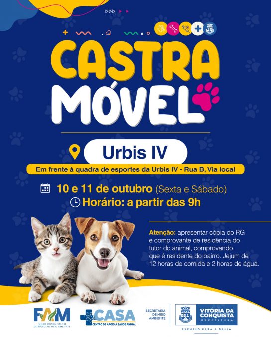 Nesta sexta-feira (10) e sábado (11), o Castramóvel estará em frente à quadra de esportes da Urbis IV, na Rua B, Via local, para o atendimento de cães e gatos dos moradores do bairro, a partir das 9h. Os tutores devem levar originais e xerox do documento de identificação (RG) e comprovante de residência. Os animais precisam estar em jejum de 12 horas de comida e duas horas de água.