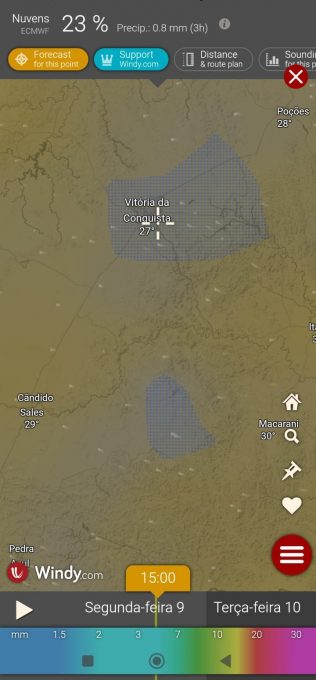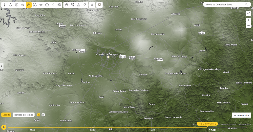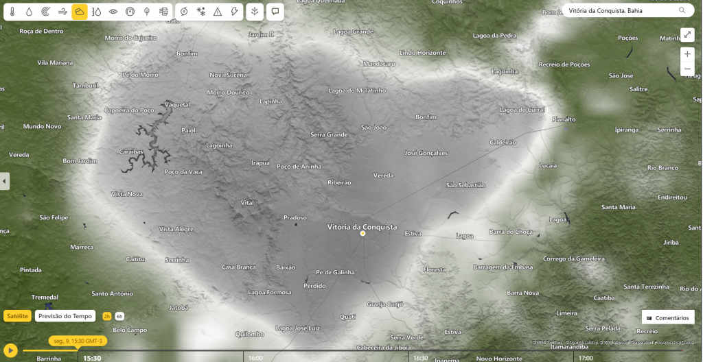 Imagens de satélite mostram uma nuvem sobre a cidade de Vitória da Conquista, mas não chegou a atingir todos os bairros. Também choveu forte na região de José Gonçalves. Já nas regiões de Bate-Pé, Inhobim e Limeira não houve registro de chuvas até o momento, segundo informações da Secretaria Municipal de Desenvolvimento Rural (SMDR).