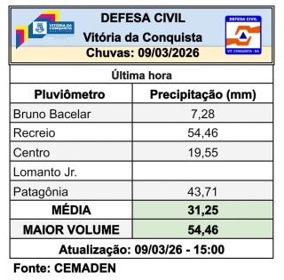Uma chuva inesperada atingiu Vitória da Conquista na tarde desta segunda-feira (9), causando inundações em diversos pontos da cidade. O município estava com alerta amarelo até as 10h de hoje, mas o volume não passaria de 3mm. Não houve renovação do alerta pelo Instituto Nacional de Meteorologia (Inmet). Ao contrário do que era esperado, a média de chuva foi de 31,25mm, com o maior volume chegando a 54,46mm no bairro Recreio, e 43,71mm, no Patagônia.