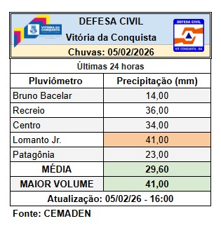 De acordo com levantamento da Defesa Civil, até as 16h de hoje, o maior volume de precipitação foi registrado pelo pluviômetro instalado no Estádio Lomanto Júnior, com 41 mm. A média de precipitação no município foi de 29,60 mm.