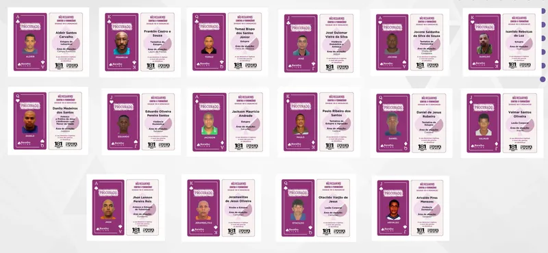 Os procurados de ouro são Jakcson Maurício Andrade, o ás, procurado por estupro, em Salvador; o rei Paulo Ribeiro dos Santos, por tentativa de estupro e agressão, também na capital; a rainha Daniel de Jesus Ribeiro com atuação em Candeal; e o valete Valdemar Santos Oliveira, agressor procurado por lesão corporal, em Jequié.