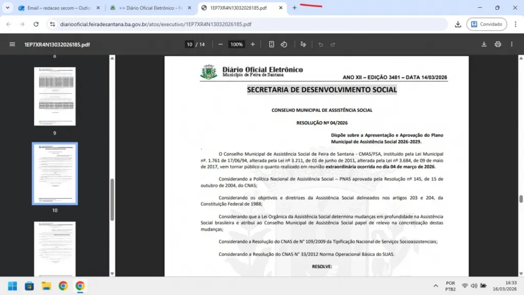 A resolução que aprova o plano foi registrada na Ata nº 446 do CMAS, também datada de 4 de março de 2026, e assinada pela presidente do conselho, Polyana Carvalho Pereira. Com a publicação no Diário Oficial, o documento passa a orientar o planejamento e a execução das ações da assistência social em Feira de Santana até 2029.