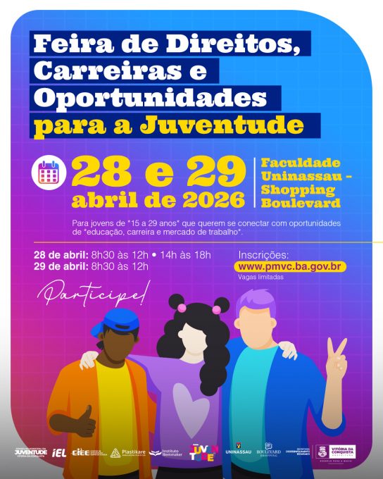 Com foco na promoção de direitos e no fortalecimento das perspectivas profissionais da juventude, a Prefeitura de Vitória da Conquista, por meio do Conselho Municipal da Juventude (Comjuv) realiza, nos dias 28 e 29 de abril, a Feira de Direitos, Carreiras e Oportunidades para a Juventude, na Faculdade Uninassau. A iniciativa é voltada para jovens de 15 a 29 anos residentes no município.