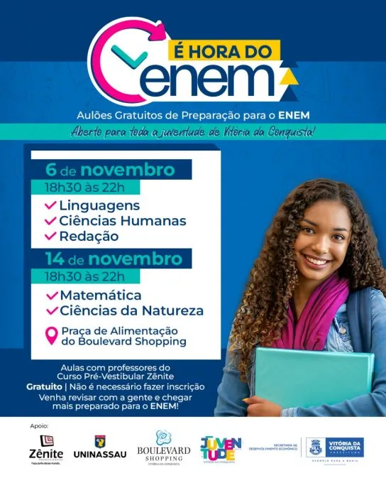 Neste domingo (16), os estudantes vão se submeter às provas de Matemática e Ciências da Natureza do Exame Nacional do Ensino Médio (Enem). No último dia 9, foram realizadas as avaliações de linguagens, ciências humanas e redação. E para ajudar os candidatos a obterem bom desempenho nas provas, a Prefeitura de Vitória da Conquista, por meio da Coordenação Municipal de Juventude, em parceria com o Curso Zênite, a Faculdade Uninassau e o Boulevard Shopping, realiza nesta sexta-feira (14) a segunda etapa do projeto “É Hora do Enem”, com aulas de revisão dos conteúdos de Matemática, Química, Física e Biologia.