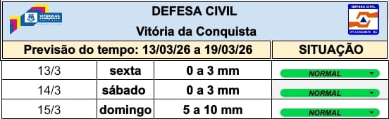 De acordo com o Instituto Nacional de Meteorologia, a previsão de chuvas para Vitória da Conquista permanece estável, com projeção de 0 a 10mm máximos até domingo (15).