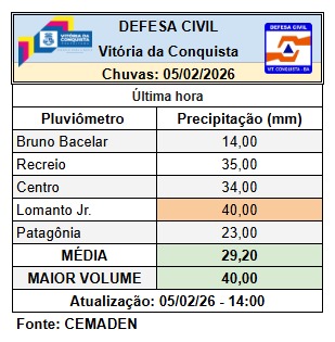 A Defesa Civil de Vitória da Conquista divulgou, nesta quinta-feira (5), o boletim atualizado com os volumes de chuva registrados em diferentes pontos do município. Os dados são baseados nos pluviômetros monitorados pelo Centro Nacional de Monitoramento e Alertas de Desastres Naturais (Cemaden).