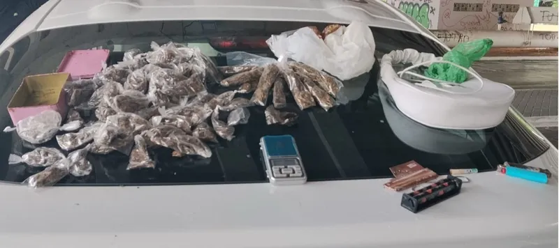 Após as buscas, foram encontradas porções de maconha, haxixe, uma balança de precisão e materiais comumente utilizados no fracionamento e comercialização de entorpecentes.