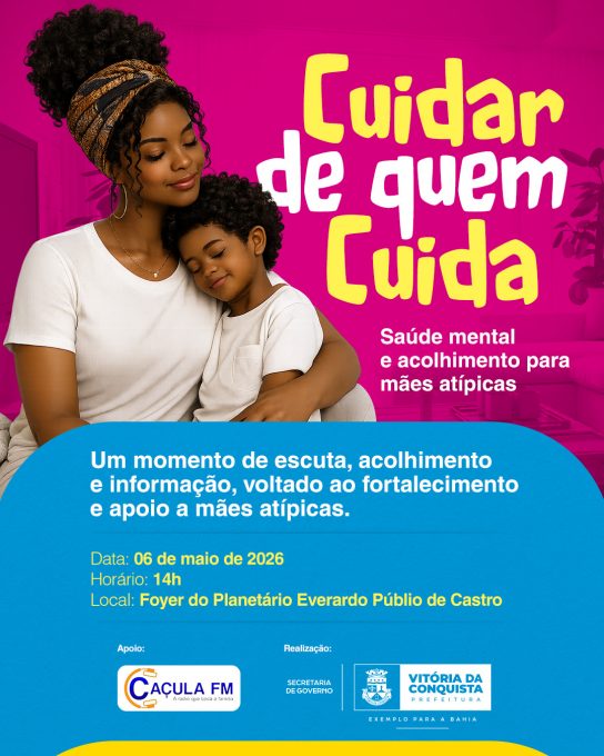 Cuidar de quem cuida é o ponto de partida para promover bem-estar e fortalecer vínculos. Com esse olhar sensível para a saúde mental e o acolhimento de mães atípicas, a Prefeitura de Vitória da Conquista, por meio da Secretaria Municipal de Governo (Segov) e da Escola de Governo, realiza no dia 6 de maio, a atividade “Cuidar de quem cuida: Saúde Mental e Acolhimento para Mães Atípicas”. O encontro acontece às 14h, no foyer do Planetário Everardo Públio de Castro.
