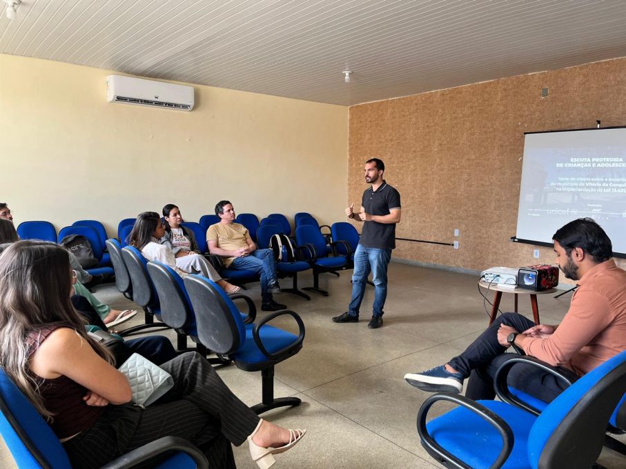 A atividade, realizada na última semana, foi dividida em três etapas. Inicialmente, o coordenador da Rede de Atenção e Defesa da Criança e do Adolescente, Jerry Lavelle, apresentou a estrutura da rede de proteção no município e explicou o processo de implementação da Lei da Escuta Protegida (Lei nº 13.431/2017) em Vitória da Conquista. Durante esse momento, foram exibidos vídeos institucionais e os estudantes puderam esclarecer dúvidas sobre o funcionamento da rede.