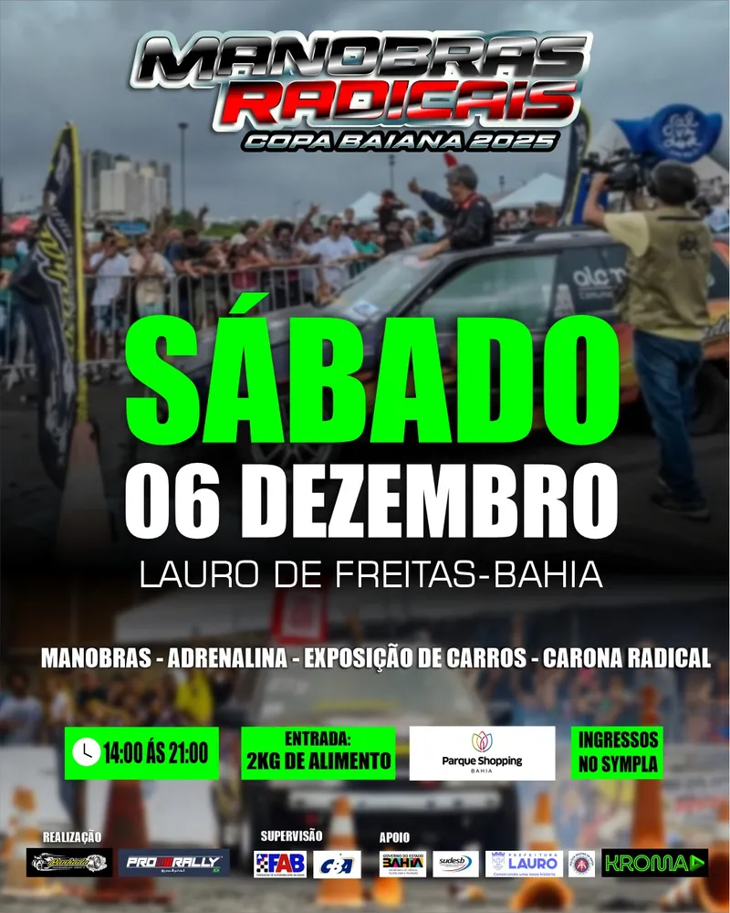 Copa Baiana de Manobras Radicais – Pros interessados em altas aventuras no automobilismo, a Copa Baiana de Manobras Radicais vai rolar neste sábado, em Lauro de Freitas. O evento promete adrenalina, manobras, drift, exposição de carros e até carona radical para os mais valentes. A atividade acontece das 9h às 21h no Parque Shopping Bahia.