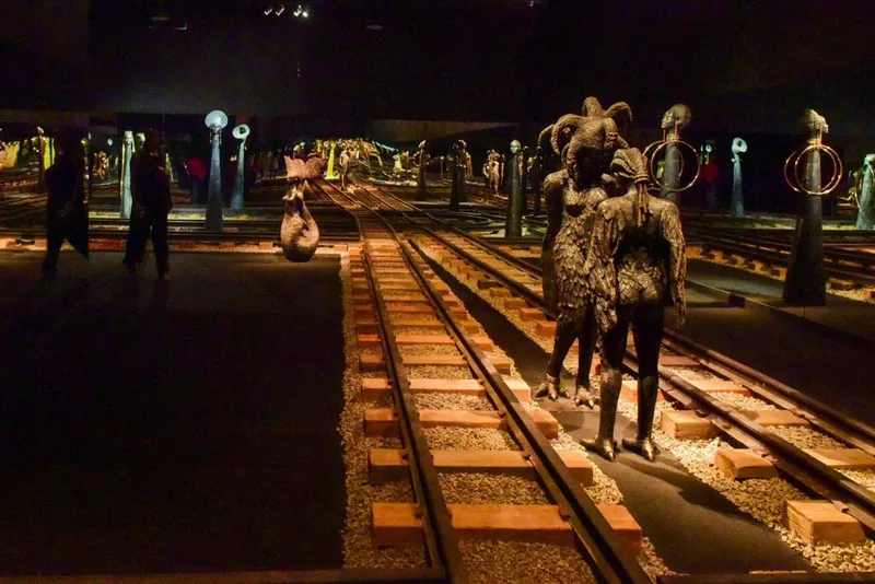 A atmosfera sensível, provocada pela iluminação suave à penumbra, convida o espectador à caminhar junto às linhas férreas que se perpetuam por caminhos para além da visão, provocadas pela amplitude do espelhamento no local. Logo na entrada, o público se depara com símbolos afro-brasileiros e escolhe seu caminho: à direita, segue em direção à sala Ego com as guerreiras Geledés e a instalação Abre-caminhos com balangandãs; à esquerda, encontra as Yabás e a sala do Oríkì (cântico ancestral) em tributo a Ogum. As linhas férreas e os espelhos criam um ambiente de deslocamento contínuo, onde o corpo do visitante torna-se parte ativa da instalação.