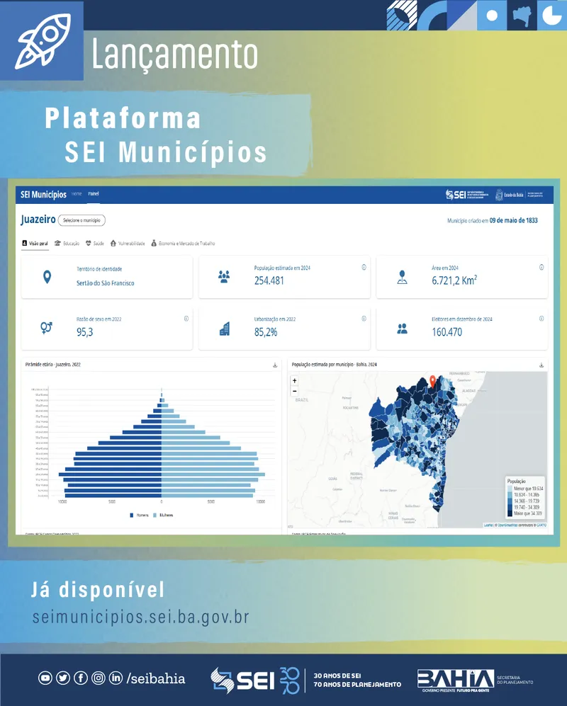 O Governo do Estado da Bahia, por meio da Superintendência de Estudos Econômicos e Sociais da Bahia (SEI), lança a plataforma SEI Municípios – uma ferramenta digital inovadora que reúne, em um só ambiente, um amplo conjunto de indicadores socioeconômicos dos 417 municípios baianos.
