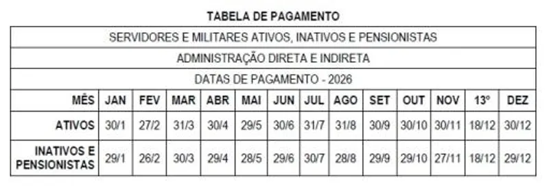Os vencimentos de inativos e pensionistas serão pagos no penúltimo dia útil de cada mês, enquanto os salários dos servidores ativos serão depositados no último dia útil do mês trabalhado. A primeira parcela do 13º salário será quitada ao longo do ano, junto com as férias, se esta for a opção do servidor, ou no mês do aniversário. Já a segunda parcela será paga no dia 18 de dezembro.