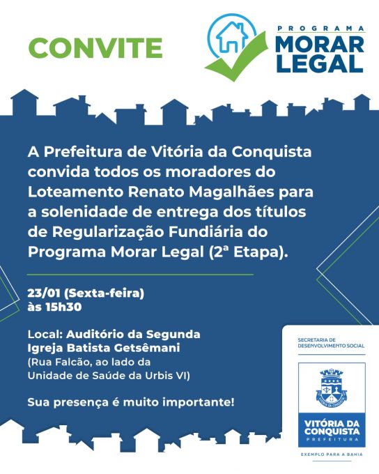 A Prefeitura de Vitória da Conquista realiza, às 15h30 desta sexta-feira (23), a segunda etapa da entrega de títulos de Regularização Fundiária Urbana (Reurb-S) do loteamento Renato Magalhães. A cerimônia acontece no auditório da Segunda Igreja Batista Getsêmani, localizado na Rua Falcão, ao lado da Unidade de Saúde da Urbis VI.