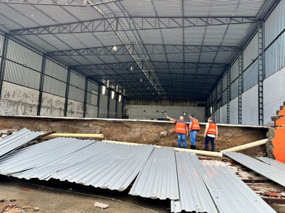 Equipes da gestão municipal seguem visitando residências e estabelecimentos comerciais atingidos pelas chuvas. No bairro Jurema, a parede e parte do telhado de um galpão desabaram sobre um carro.