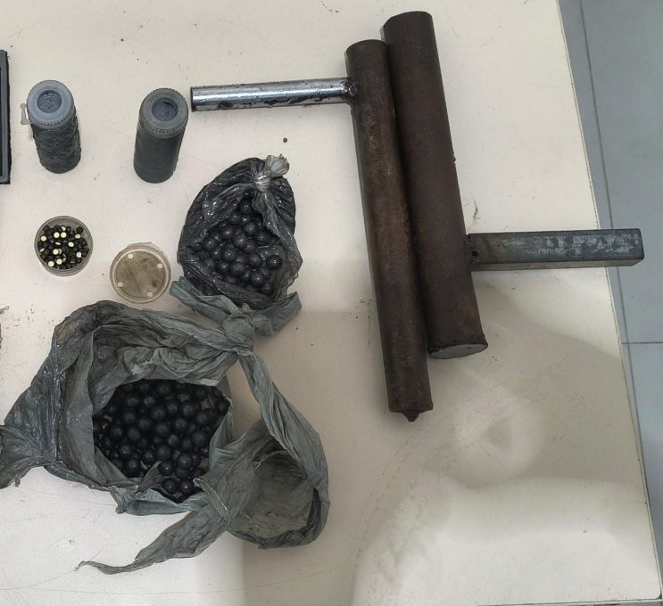 Após busca pessoal, foi encontrado em posse do cidadão, uma arma de fogo artesanal e diversas munições, a exemplo de um pote de espoletas (90 unidades), 159 unidades de balotes de chumbo e dois potes de pólvora, além de três facas de mesa. Não foram encontradas drogas e nem outros tipos de armas.