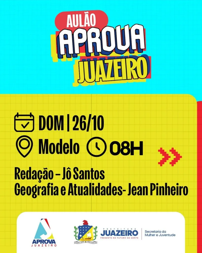 A Prefeitura de Juazeiro, por meio da Secretaria da Mulher e Juventude (SMJ), informa que ainda restam vagas para o segundo ciclo de aulões do programa Aprova Juazeiro, que será realizado neste domingo, 26 de outubro, no Colégio Modelo Luiz Eduardo Magalhães, localizado na Rua Alan Carino, 595, bairro João XXIII, das 8h às 12h.