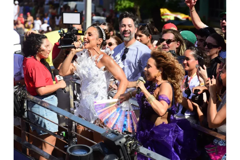 O momento mais alto do desfile veio logo em seguida, quando Ivete Sangalo convidou Daniela Mercury para subir ao trio e cantar com ela, deixando clara a admiração que sente pela artista: “deixa eu chamar a Rainha do Axé para cantar comigo”.