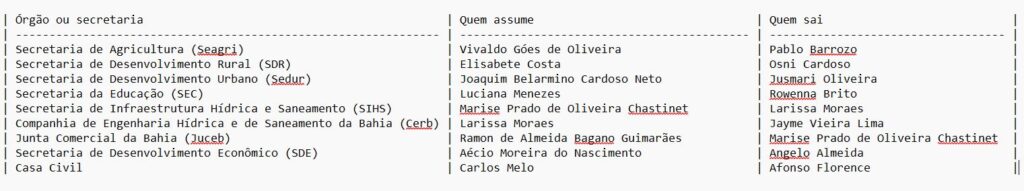 Ao comentar as mudanças, Jerônimo destacou que a reestruturação ocorre dentro da normalidade administrativa. “É uma troca dentro da normalidade, mantendo a pluralidade e a representação dos partidos aliados, com nomes de confiança que irão contribuir para a continuidade das ações realizadas pelo Governo do Estado, visando o desenvolvimento e a qualidade de vida do povo baiano”, afirmou Jerônimo, que completou: “Aos secretários que vão para compromissos políticos, o meu muito obrigado pela dedicação. Cada entrega ajudou a transformar a vida da nossa gente”.