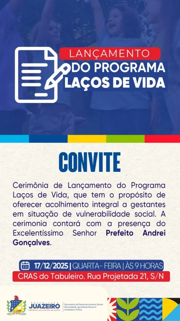 A Prefeitura de Juazeiro lança, nesta quarta-feira (17), o Programa Municipal “Laços de Vida”, que oferecerá acolhimento integral a gestantes em situação de vulnerabilidade social. A iniciativa, desenvolvida pela Secretaria de Desenvolvimento Social, Diversidade, Igualdade Racial e Combate à Fome/SEDES, reforça ações de proteção, cuidado e promoção da dignidade das famílias juazeirenses.