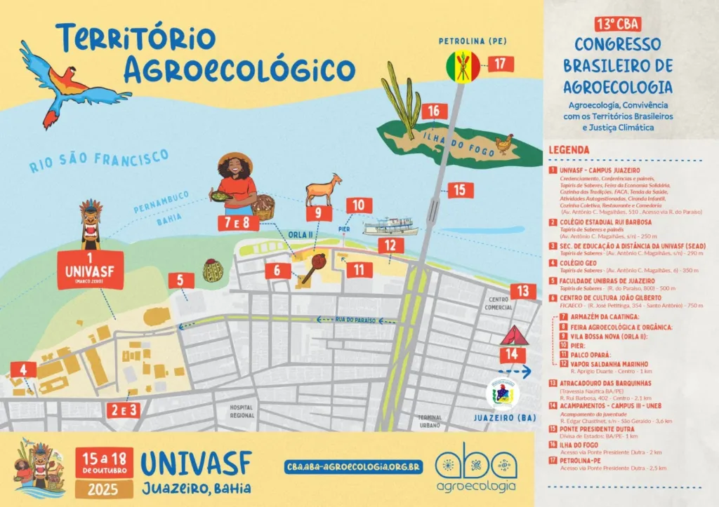 Juazeiro será a primeira cidade do Semiárido brasileiro a receber o 13º Congresso Brasileiro de Agroecologia (CBA), que acontece de 15 a 18 de outubro. O evento deve reunir mais de 5 mil participantes, entre pesquisadores, agricultores, movimentos sociais, povos originários, quilombolas, juventudes e ministros de Estado, em uma intensa programação.