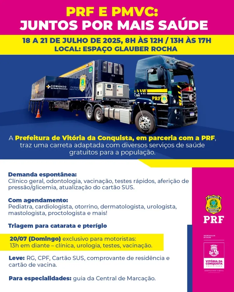 A partir desta sexta-feira (18), o Governo Municipal disponibilizará diversos serviços de saúde gratuitos para a população, por meio da ação Saúde em Movimento, uma ação realizada pela Secretaria Municipal de Saúde (SMS) em parceria com a Polícia Rodoviária Federal (PRF). A atividade acontecerá até a segunda-feira (21), no Espaço Cultural Glauber Rocha, por meio de uma estrutura adaptada em um veículo tipo carreta.
