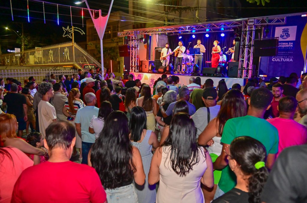 O encerramento da programação da Carreta da Cultura no Natal Conquista de Luz, neste domingo (28), foi marcado por um encontro entre a tradição ancestral e o refinamento musical. O público que lotou a praça pôde acompanhar a força do Terno de Reis Memória Resgatada, do distrito do Pradoso, e o talento do Grupo Roama, em uma noite que celebrou a identidade cultural conquistense.