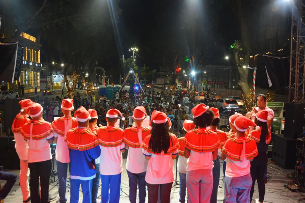 A noite desta sexta-feira (19) foi marcada por muita emoção e espírito natalino no estacionamento do Paço Municipal Maria Quitéria. A programação do Natal Encantado, promovida pela Prefeitura de Feira de Santana, reuniu famílias para acompanhar uma série de apresentações culturais no palco principal e a interatividade da Vila do Papai Noel, que contou com uma presença em dose dupla para a alegria da criançada.