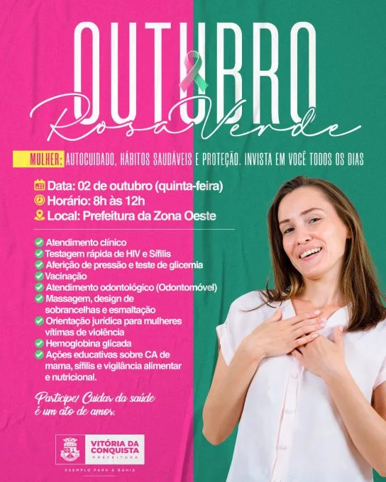 A Prefeitura de Vitória da Conquista, por meio da Secretaria Municipal de Saúde, em parceria com a Secretaria Municipal de Políticas para Mulheres, realiza o lançamento das campanhas Outubro Rosa, de prevenção ao câncer de mama e do colo do útero, e Outubro Verde, de prevenção à sífilis, nesta quinta-feira (2).
