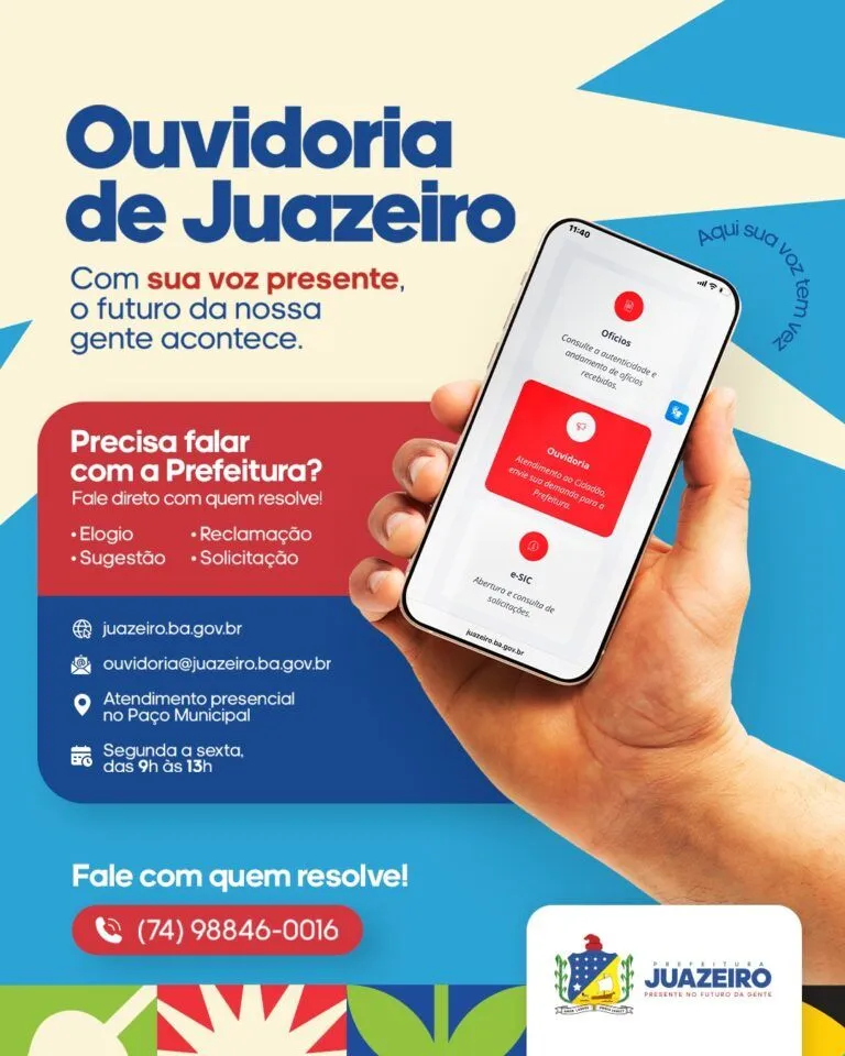 A Ouvidoria Geral do Município de Juazeiro está ainda mais acessível à população. Para reforçar esse canal de diálogo entre o cidadão e a Prefeitura, cartazes informativos serão fixados em todas as repartições públicas municipais. A iniciativa visa estimular a participação popular, facilitando o registro de reclamações, sugestões, denúncias, elogios e solicitações.