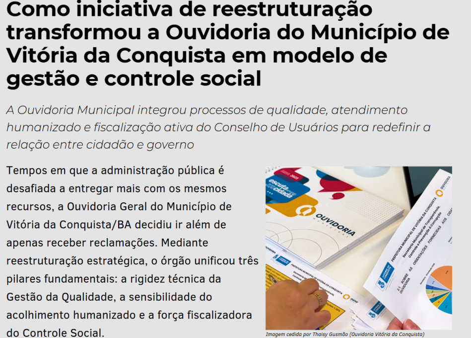 Pela primeira vez, Vitória da Conquista foi reconhecida na Revista Eletrônica da Rede Nacional de Ouvidorias (Renouv). A edição de novembro e dezembro de 2025 traz um artigo que aborda a reestruturação pela qual o órgão passou, otimizando o fluxo interno de processos por meio de tecnologias digitais, aplicando a escuta ativa para atender aos cidadãos de forma humanizada e estreitando os vínculos com a sociedade civil.
