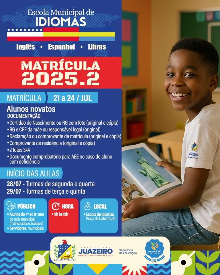 Mantida pela Prefeitura de Juazeiro, através da Secretaria de Educação, a Escola de idiomas ofertará 168 novas vagas, para o semestre 2025.2, em três turnos: manhã, tarde e noite. Podem se inscrever estudantes que estejam cursando entre o 4º e 8º ano do Ensino Fundamental, em escolas da rede municipal de ensino, e servidores municipais.